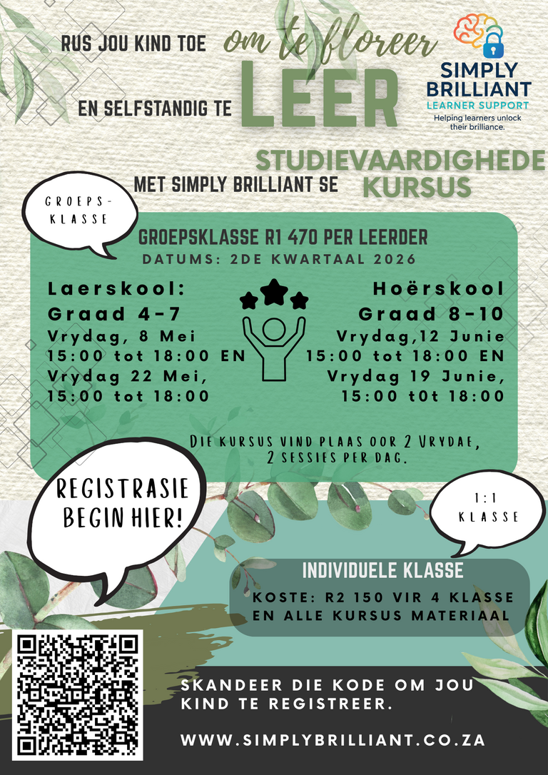 The Simply Brilliant Study Skills course consists of four practical sessions and is suitable for children from grades 4-10. We focus on developing the skills a student needs to learn easily.